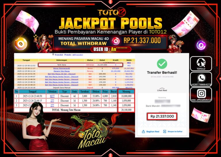 Selamat kepada Member Kami An****** Telah Jackpot dan berhasil mendapatkan kemenangan besar pada permainan JACKPOT POOLS PASARAN (MACAU 4D) Dengan Kemenangan Sebesar Rp.21.337.000 –. Setelah mengisi Fomulir Withdraw dengan Kurang waktu 1-2 Menit Dana sudah kami Trasnfer kepada Pemilik Userid dan dana sudah dapat di cairkan oleh pemenang. Bukti Pembayaran yang TOTO12 berikan merupakan Bukti Pembayaran…