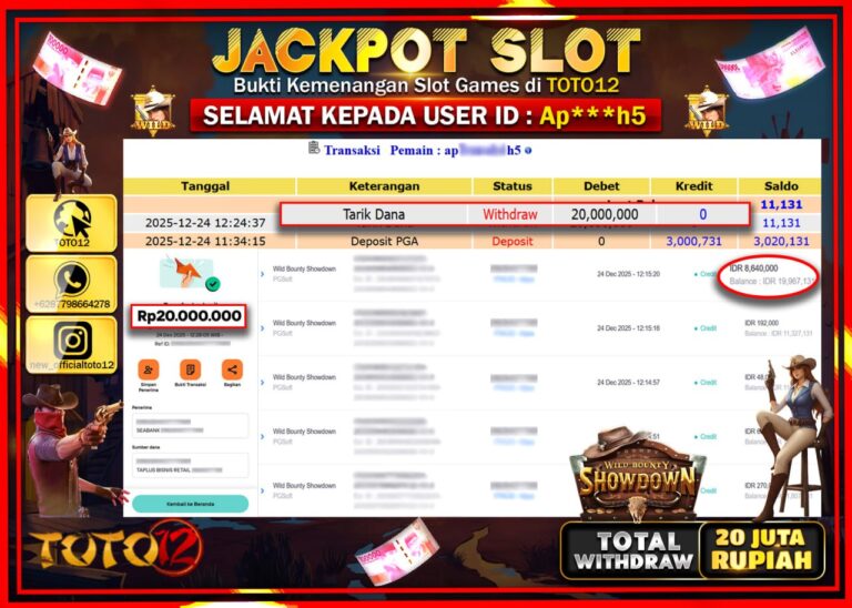 Selamat kepada Member Kami Ap****** Telah Jackpot dan berhasil mendapatkan kemenangan besar pada permainan JACKPOT SLOT GAME (WILD BOUNTY SHOWDOWN) Dengan Kemenangan Sebesar Rp.20.000.000 –. Setelah mengisi Fomulir Withdraw dengan Kurang waktu 1-2 Menit Dana sudah kami Trasnfer kepada Pemilik Userid dan dana sudah dapat di cairkan oleh pemenang. Bukti Pembayaran yang TOTO12 berikan merupakan Bukti…