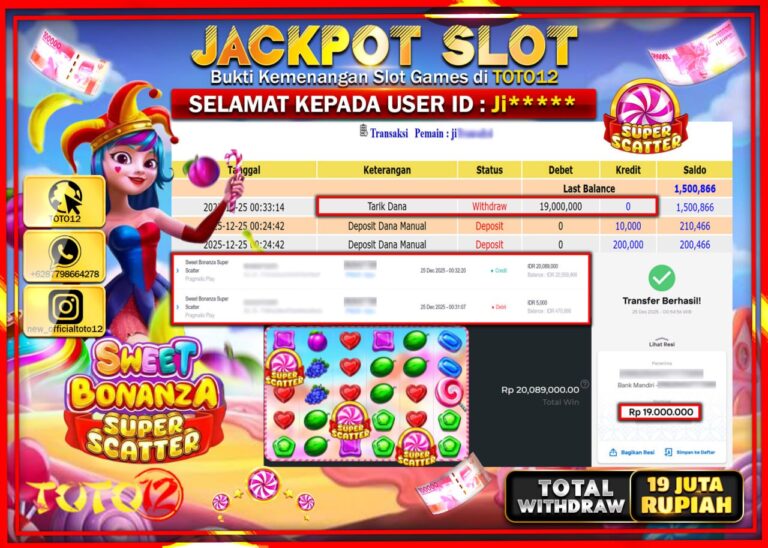 Selamat kepada Member Kami Ji****** Telah Jackpot dan berhasil mendapatkan kemenangan besar pada permainan JACKPOT SLOT GAME (SWEET BONANZA SUPER SCATTER) Dengan Kemenangan Sebesar Rp.19.000.000 –. Setelah mengisi Fomulir Withdraw dengan Kurang waktu 1-2 Menit Dana sudah kami Trasnfer kepada Pemilik Userid dan dana sudah dapat di cairkan oleh pemenang. Bukti Pembayaran yang TOTO12 berikan merupakan…