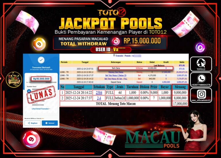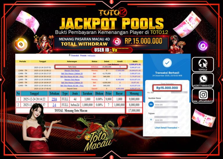 Selamat kepada Member Kami Va****** Telah Jackpot dan berhasil mendapatkan kemenangan besar pada permainan JACKPOT POOLS PASARAN (MACAU 4D) Dengan Kemenangan Sebesar Rp.15.000.000 –. Setelah mengisi Fomulir Withdraw dengan Kurang waktu 1-2 Menit Dana sudah kami Trasnfer kepada Pemilik Userid dan dana sudah dapat di cairkan oleh pemenang. Bukti Pembayaran yang TOTO12 berikan merupakan Bukti Pembayaran…