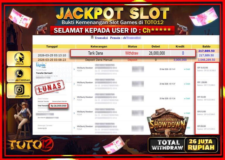 Selamat kepada Member Kami Ch**** Telah Jackpot dan berhasil mendapatkan kemenangan besar pada permainan JACKPOT SLOT GAME (WILD BOUNTY SHOWDOWN) Dengan Kemenangan Sebesar Rp.26.000.000–. Setelah mengisi Fomulir Withdraw dengan Kurang waktu 1-2 Menit Dana sudah kami Trasnfer kepada Pemilik Userid dan dana sudah dapat di cairkan oleh pemenang. Bukti Pembayaran yang TOTO12 berikan merupakan Bukti Pembayaran…