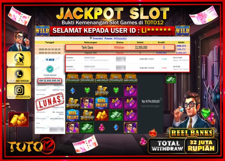 Selamat kepada Member Kami Li**** Telah Jackpot dan berhasil mendapatkan kemenangan besar pada permainan JACKPOT SLOT GAME (REEL BANKS) Dengan Kemenangan Sebesar Rp.32.500.000–. Setelah mengisi Fomulir Withdraw dengan Kurang waktu 1-2 Menit Dana sudah kami Trasnfer kepada Pemilik Userid dan dana sudah dapat di cairkan oleh pemenang. Bukti Pembayaran yang TOTO12 berikan merupakan Bukti Pembayaran yang SAH…