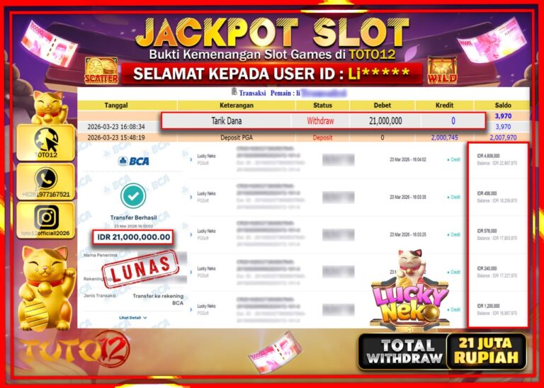 Selamat kepada Member Kami Li**** Telah Jackpot dan berhasil mendapatkan kemenangan besar pada permainan JACKPOT SLOT GAME (LUCKY NEKO) Dengan Kemenangan Sebesar Rp.21.000.000–. Setelah mengisi Fomulir Withdraw dengan Kurang waktu 1-2 Menit Dana sudah kami Trasnfer kepada Pemilik Userid dan dana sudah dapat di cairkan oleh pemenang. Bukti Pembayaran yang TOTO12 berikan merupakan Bukti Pembayaran yang SAH…