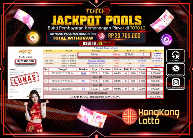 Selamat kepada Member Kami CE**** Telah Jackpot dan berhasil mendapatkan kemenangan besar pada permainan JACKPOT LIVE GAMES CASINO (HONGKONG) Dengan Kemenangan Sebesar Rp.20.705.000–. Setelah mengisi Fomulir Withdraw dengan Kurang waktu 1-2 Menit Dana sudah kami Trasnfer kepada Pemilik Userid dan dana sudah dapat di cairkan oleh pemenang. Bukti Pembayaran yang TOTO12 berikan merupakan Bukti Pembayaran yang SAH…