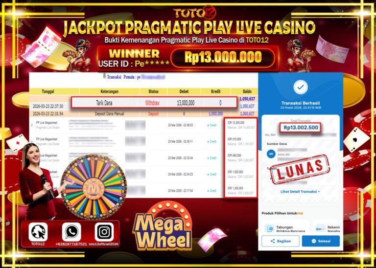Selamat kepada Member Kami Pe****** Telah Jackpot dan berhasil mendapatkan kemenangan besar pada permainan JACKPOT PRAGMATIC PLAY LIVE GAME CASINO (PP LIVE MEGAWHEEL) Dengan Kemenangan Sebesar Rp.13.000.000–. Setelah mengisi Fomulir Withdraw dengan Kurang waktu 1-2 Menit Dana sudah kami Trasnfer kepada Pemilik Userid dan dana sudah dapat di cairkan oleh pemenang. Bukti Pembayaran yang TOTO12 berikan…