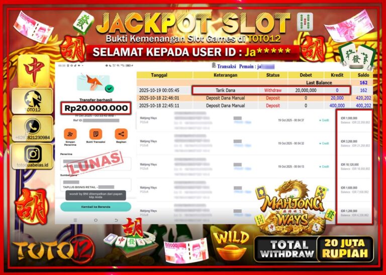 Selamat kepada Member Kami Ja****** Telah Jackpot dan berhasil mendapatkan kemenangan besar pada permainan JACKPOT SLOT GAME (MAHJONG WAYS) Dengan Kemenangan Sebesar Rp.20.000.000 –. Setelah mengisi Fomulir Withdraw dengan Kurang waktu 1-2 Menit Dana sudah kami Trasnfer kepada Pemilik Userid dan dana sudah dapat di cairkan oleh pemenang. Bukti Pembayaran yang TOTO12 berikan merupakan Bukti Pembayaran…