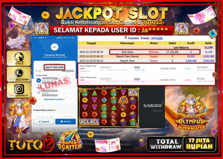 Selamat kepada Member Kami Ja****** Telah Jackpot dan berhasil mendapatkan kemenangan besar pada permainan JACKPOT SLOT GAME (GATES OF OLYMPUS SUPER SCATTER) Dengan Kemenangan Sebesar Rp.17.100.000 –. Setelah mengisi Fomulir Withdraw dengan Kurang waktu 1-2 Menit Dana sudah kami Trasnfer kepada Pemilik Userid dan dana sudah dapat di cairkan oleh pemenang. Bukti Pembayaran yang TOTO12 berikan…