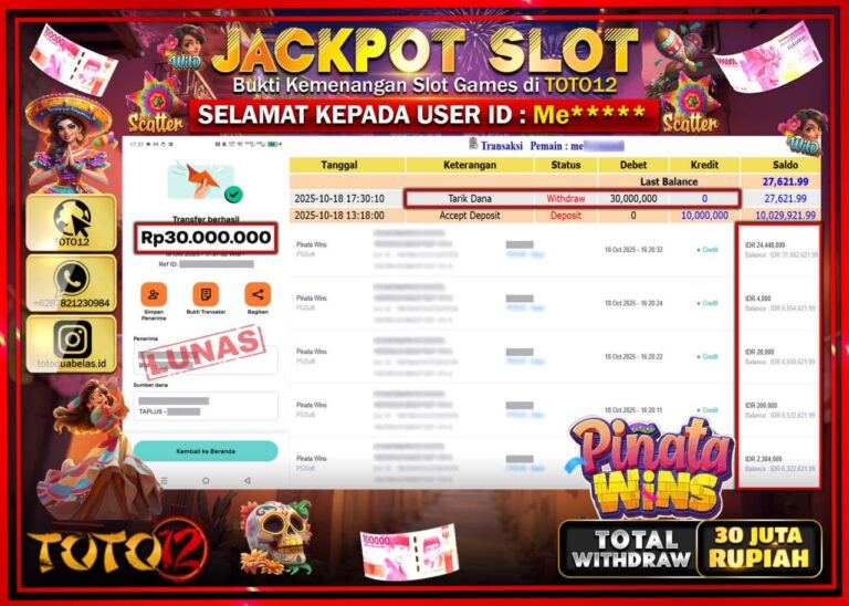 Selamat kepada Member Kami Me****** Telah Jackpot dan berhasil mendapatkan kemenangan besar pada permainan JACKPOT SLOT GAME (PINATA WINS) Dengan Kemenangan Sebesar Rp.30.000.000 –. Setelah mengisi Fomulir Withdraw dengan Kurang waktu 1-2 Menit Dana sudah kami Trasnfer kepada Pemilik Userid dan dana sudah dapat di cairkan oleh pemenang. Bukti Pembayaran yang TOTO12 berikan merupakan Bukti Pembayaran…