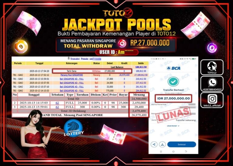 Selamat kepada Member Kami Am****** Telah Jackpot dan berhasil mendapatkan kemenangan besar pada permainan JACKPOT POOLS PASARAN (SINGAPORE) Dengan Kemenangan Sebesar Rp.27.000.000 –. Setelah mengisi Fomulir Withdraw dengan Kurang waktu 1-2 Menit Dana sudah kami Trasnfer kepada Pemilik Userid dan dana sudah dapat di cairkan oleh pemenang. Bukti Pembayaran yang TOTO12 berikan merupakan Bukti Pembayaran yang …