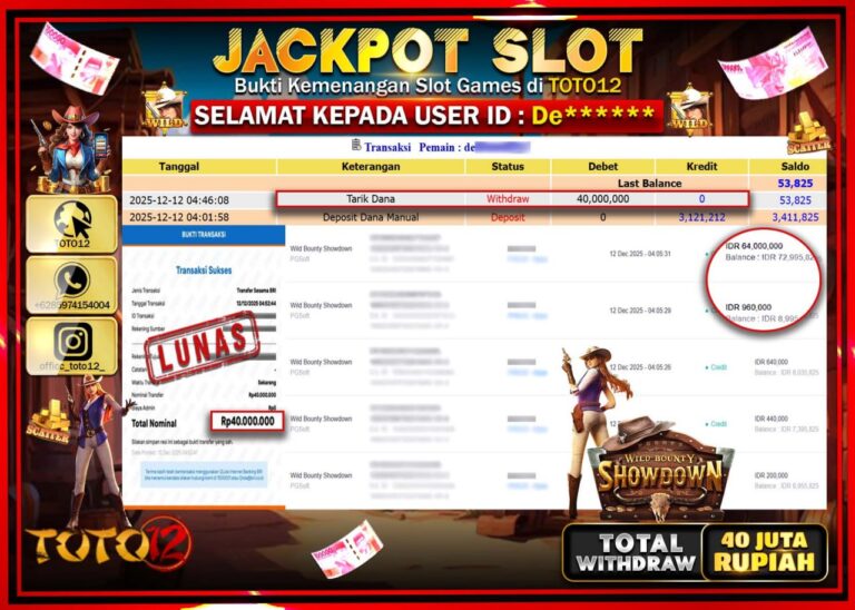 Selamat kepada Member Kami De****** Telah Jackpot dan berhasil mendapatkan kemenangan besar pada permainan JACKPOT SLOT GAME (WILD BOUNTY SHOWDOWN) Dengan Kemenangan Sebesar Rp.40.000.000 –. Setelah mengisi Fomulir Withdraw dengan Kurang waktu 1-2 Menit Dana sudah kami Trasnfer kepada Pemilik Userid dan dana sudah dapat di cairkan oleh pemenang. Bukti Pembayaran yang TOTO12 berikan merupakan Bukti…