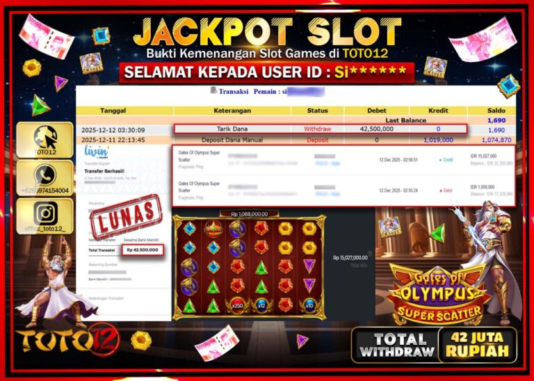 Selamat kepada Member Kami Si****** Telah Jackpot dan berhasil mendapatkan kemenangan besar pada permainan JACKPOT SLOT GAME (GATES OF OLYMPUS SUPER SCATTER) Dengan Kemenangan Sebesar Rp.42.500.000 –. Setelah mengisi Fomulir Withdraw dengan Kurang waktu 1-2 Menit Dana sudah kami Trasnfer kepada Pemilik Userid dan dana sudah dapat di cairkan oleh pemenang. Bukti Pembayaran yang TOTO12 berikan…