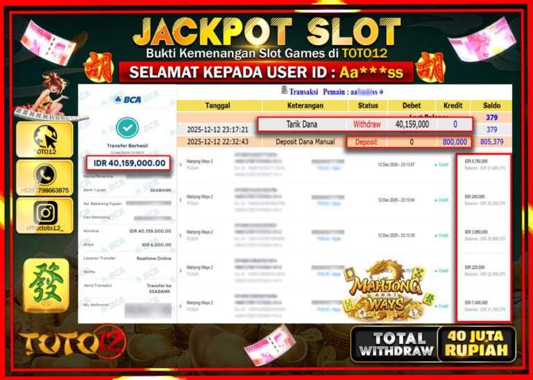 Selamat kepada Member Kami Aa****** Telah Jackpot dan berhasil mendapatkan kemenangan besar pada permainan JACKPOT SLOT GAME (MAHJONG WAYS) Dengan Kemenangan Sebesar Rp.40.159.000 –. Setelah mengisi Fomulir Withdraw dengan Kurang waktu 1-2 Menit Dana sudah kami Trasnfer kepada Pemilik Userid dan dana sudah dapat di cairkan oleh pemenang. Bukti Pembayaran yang TOTO12 berikan merupakan Bukti Pembayaran…