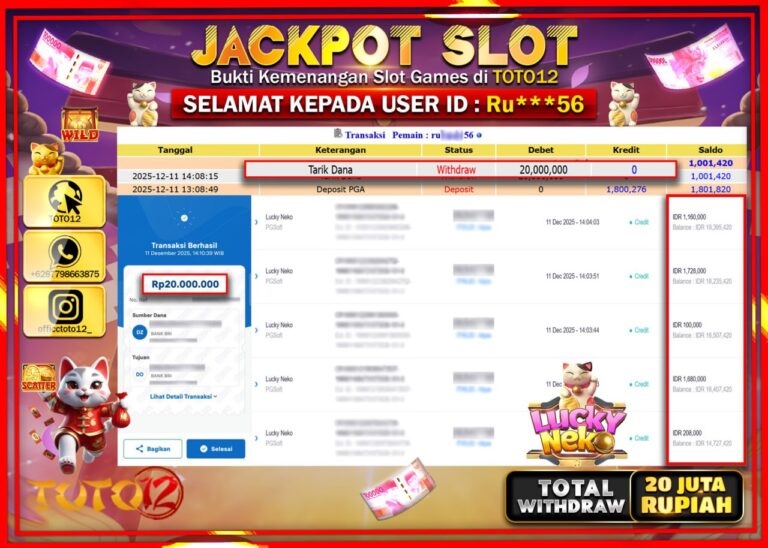 Selamat kepada Member Kami Ru****** Telah Jackpot dan berhasil mendapatkan kemenangan besar pada permainan JACKPOT SLOT GAME (LUCKY NEKO) Dengan Kemenangan Sebesar Rp.20.000.000 –. Setelah mengisi Fomulir Withdraw dengan Kurang waktu 1-2 Menit Dana sudah kami Trasnfer kepada Pemilik Userid dan dana sudah dapat di cairkan oleh pemenang. Bukti Pembayaran yang TOTO12 berikan merupakan Bukti Pembayaran…