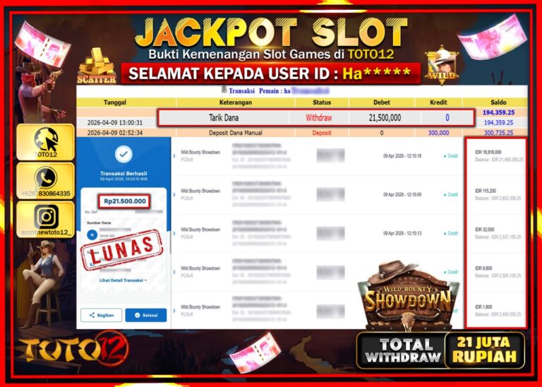 Selamat kepada Member Kami Ha***** Telah Jackpot dan berhasil mendapatkan kemenangan besar pada permainan JACKPOT SLOT GAME (WILD BOUNTY SHOWDOWN) Dengan Kemenangan Sebesar Rp.21.500.000–. Setelah mengisi Fomulir Withdraw dengan Kurang waktu 1-2 Menit Dana sudah kami Trasnfer kepada Pemilik Userid dan dana sudah dapat di cairkan oleh pemenang. Bukti Pembayaran yang TOTO12 berikan merupakan Bukti Pembayaran…