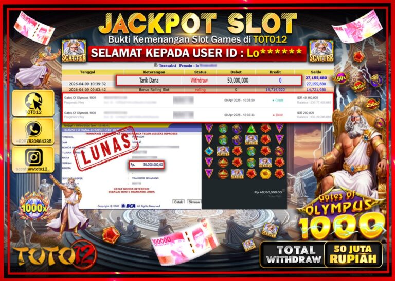 Selamat kepada Member Kami Lo***** Telah Jackpot dan berhasil mendapatkan kemenangan besar pada permainan JACKPOT SLOT GAME (GATES OF OLYMPUS 1000) Dengan Kemenangan Sebesar Rp.50.000.000–. Setelah mengisi Fomulir Withdraw dengan Kurang waktu 1-2 Menit Dana sudah kami Trasnfer kepada Pemilik Userid dan dana sudah dapat di cairkan oleh pemenang. Bukti Pembayaran yang TOTO12 berikan merupakan Bukti…