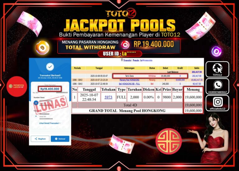 Selamat kepada Member Kami La****** Telah Jackpot dan berhasil mendapatkan kemenangan besar pada permainan JACKPOT POOLS PASARAN (HONGKONG) Dengan Kemenangan Sebesar Rp.19.400.000 –. Setelah mengisi Fomulir Withdraw dengan Kurang waktu 1-2 Menit Dana sudah kami Trasnfer kepada Pemilik Userid dan dana sudah dapat di cairkan oleh pemenang. Bukti Pembayaran yang TOTO12 berikan merupakan Bukti Pembayaran yang …