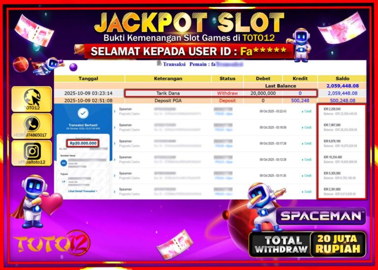 Selamat kepada Member Kami Fa****** Telah Jackpot dan berhasil mendapatkan kemenangan besar pada permainan JACKPOT SLOT GAME (SPACEMAN) Dengan Kemenangan Sebesar Rp.20.000.000 –. Setelah mengisi Fomulir Withdraw dengan Kurang waktu 1-2 Menit Dana sudah kami Trasnfer kepada Pemilik Userid dan dana sudah dapat di cairkan oleh pemenang. Bukti Pembayaran yang TOTO12 berikan merupakan Bukti Pembayaran yang …