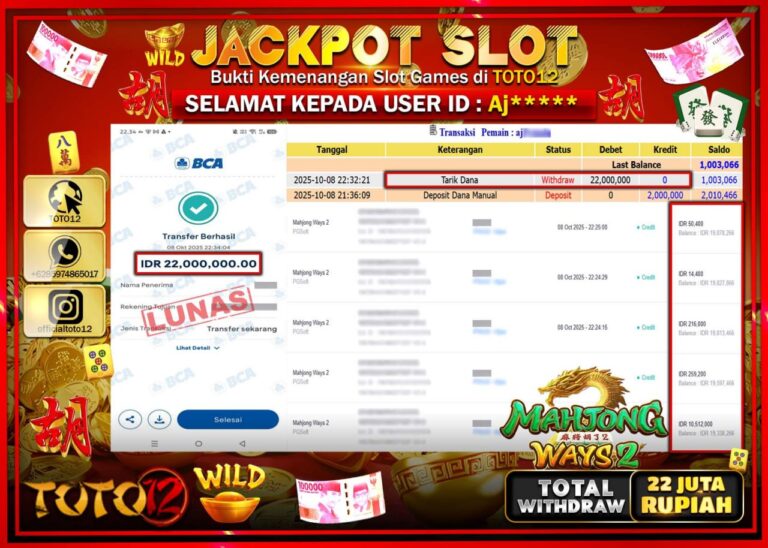 Selamat kepada Member Kami Aj****** Telah Jackpot dan berhasil mendapatkan kemenangan besar pada permainan JACKPOT SLOT GAME (MAHJONG WAYS 2) Dengan Kemenangan Sebesar Rp.22.000.000 –. Setelah mengisi Fomulir Withdraw dengan Kurang waktu 1-2 Menit Dana sudah kami Trasnfer kepada Pemilik Userid dan dana sudah dapat di cairkan oleh pemenang. Bukti Pembayaran yang TOTO12 berikan merupakan Bukti…