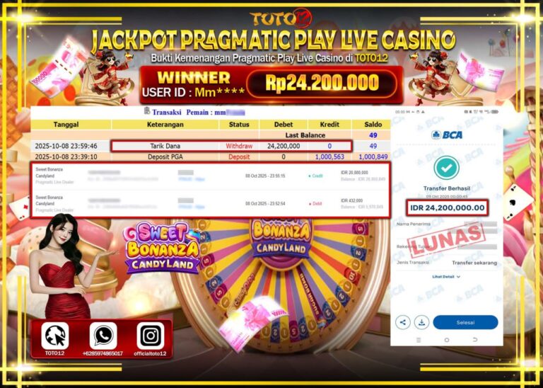 Selamat kepada Member Kami Mm****** Telah Jackpot dan berhasil mendapatkan kemenangan besar pada permainan JACKPOT PRAGMATIC PLAY LIVE CASINO (SWEET BONANZA CANDY LAND) Dengan Kemenangan Sebesar Rp.24.200.000 –. Setelah mengisi Fomulir Withdraw dengan Kurang waktu 1-2 Menit Dana sudah kami Trasnfer kepada Pemilik Userid dan dana sudah dapat di cairkan oleh pemenang. Bukti Pembayaran yang TOTO12…