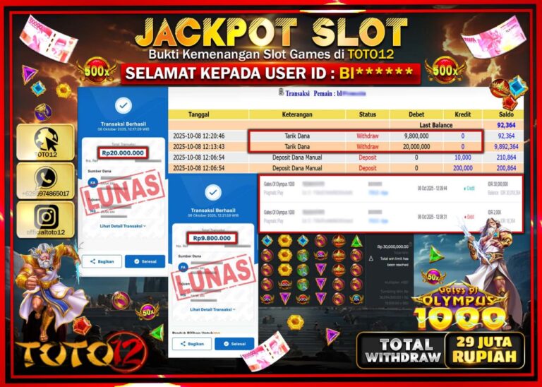 Selamat kepada Member Kami Bl****** Telah Jackpot dan berhasil mendapatkan kemenangan besar pada permainan JACKPOT SLOT GAME (GATES OF OLYMPUS 1000) Dengan Kemenangan Sebesar Rp.29.800.000 –. Setelah mengisi Fomulir Withdraw dengan Kurang waktu 1-2 Menit Dana sudah kami Trasnfer kepada Pemilik Userid dan dana sudah dapat di cairkan oleh pemenang. Bukti Pembayaran yang TOTO12 berikan merupakan…