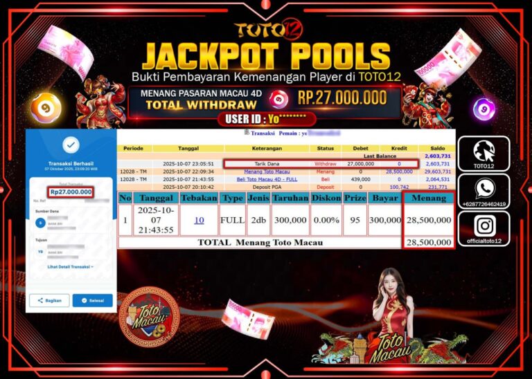 Selamat kepada Member Kami Yo****** Telah Jackpot dan berhasil mendapatkan kemenangan besar pada permainan JACKPOT POOLS PASARAN (MACAU 4D) Dengan Kemenangan Sebesar Rp.21.000.000 –. Setelah mengisi Fomulir Withdraw dengan Kurang waktu 1-2 Menit Dana sudah kami Trasnfer kepada Pemilik Userid dan dana sudah dapat di cairkan oleh pemenang. Bukti Pembayaran yang TOTO12 berikan merupakan Bukti Pembayaran…