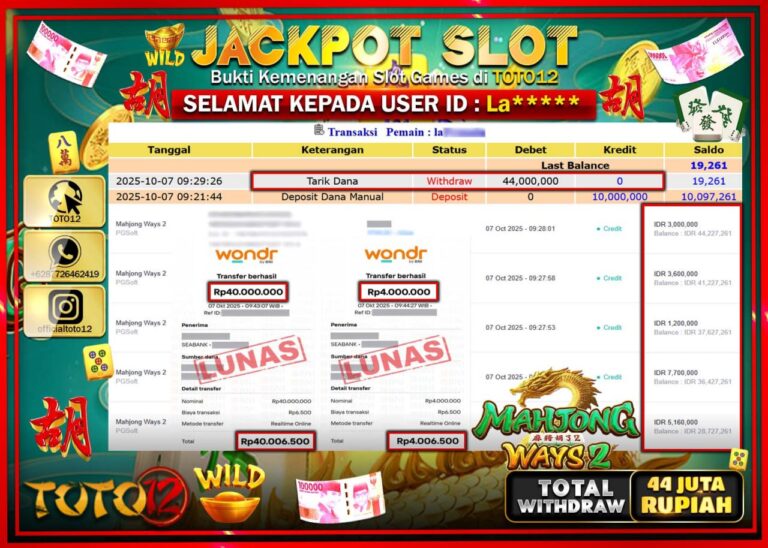Selamat kepada Member Kami La****** Telah Jackpot dan berhasil mendapatkan kemenangan besar pada permainan JACKPOT SLOT GAME (MAHJONG WAYS 2) Dengan Kemenangan Sebesar Rp.44.000.000 –. Setelah mengisi Fomulir Withdraw dengan Kurang waktu 1-2 Menit Dana sudah kami Trasnfer kepada Pemilik Userid dan dana sudah dapat di cairkan oleh pemenang. Bukti Pembayaran yang TOTO12 berikan merupakan Bukti…