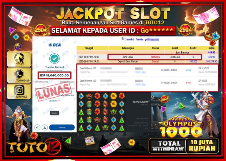 Selamat kepada Member Kami Go****** Telah Jackpot dan berhasil mendapatkan kemenangan besar pada permainan JACKPOT SLOT GAME (GATES OF OLYMPUS 1000) Dengan Kemenangan Sebesar Rp.18.040.000 –. Setelah mengisi Fomulir Withdraw dengan Kurang waktu 1-2 Menit Dana sudah kami Trasnfer kepada Pemilik Userid dan dana sudah dapat di cairkan oleh pemenang. Bukti Pembayaran yang TOTO12 berikan merupakan…