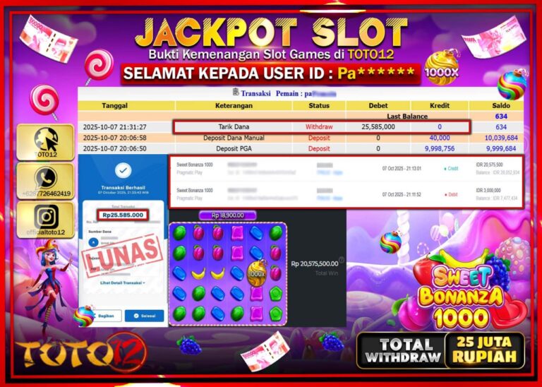 Selamat kepada Member Kami Pa****** Telah Jackpot dan berhasil mendapatkan kemenangan besar pada permainan JACKPOT SLOT GAME (SWEET BONANZA 1000) Dengan Kemenangan Sebesar Rp.25.585.000 –. Setelah mengisi Fomulir Withdraw dengan Kurang waktu 1-2 Menit Dana sudah kami Trasnfer kepada Pemilik Userid dan dana sudah dapat di cairkan oleh pemenang. Bukti Pembayaran yang TOTO12 berikan merupakan Bukti…