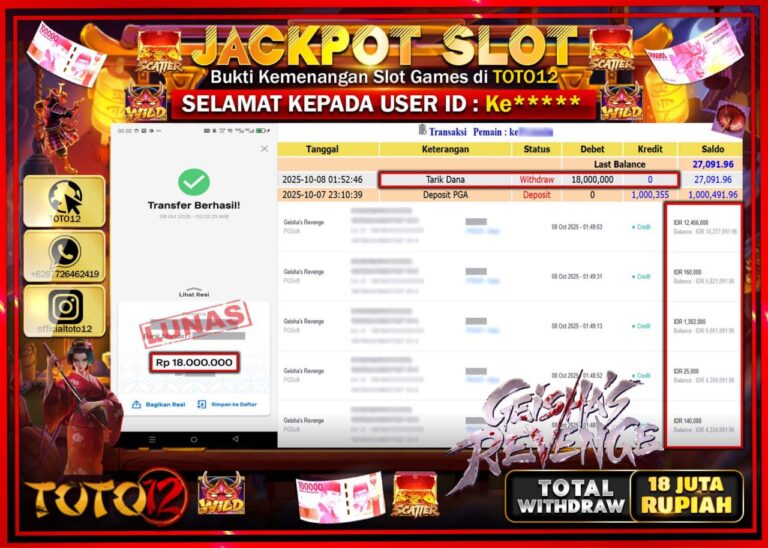 Selamat kepada Member Kami Ke****** Telah Jackpot dan berhasil mendapatkan kemenangan besar pada permainan JACKPOT SLOT GAME (GEISHAS REVENGE) Dengan Kemenangan Sebesar Rp.18.000.000 –. Setelah mengisi Fomulir Withdraw dengan Kurang waktu 1-2 Menit Dana sudah kami Trasnfer kepada Pemilik Userid dan dana sudah dapat di cairkan oleh pemenang. Bukti Pembayaran yang TOTO12 berikan merupakan Bukti Pembayaran…