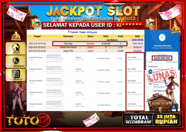 Selamat kepada Member Kami Kl****** Telah Jackpot dan berhasil mendapatkan kemenangan besar pada permainan JACKPOT SLOT GAME (WILD BOUNTY SHOWDOWN) Dengan Kemenangan Sebesar Rp.25.000.000 –. Setelah mengisi Fomulir Withdraw dengan Kurang waktu 1-2 Menit Dana sudah kami Trasnfer kepada Pemilik Userid dan dana sudah dapat di cairkan oleh pemenang. Bukti Pembayaran yang TOTO12 berikan merupakan Bukti…