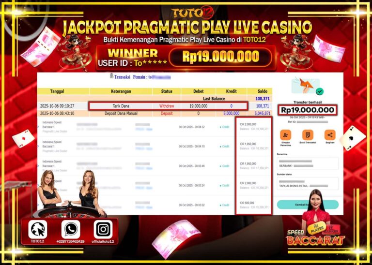 Selamat kepada Member Kami To****** Telah Jackpot dan berhasil mendapatkan kemenangan besar pada permainan JACKPOT PRAGMATIC PLAY LIVE CASINO (INDONESIA SPEED BACCARAT 1) Dengan Kemenangan Sebesar Rp.19.000.000 –. Setelah mengisi Fomulir Withdraw dengan Kurang waktu 1-2 Menit Dana sudah kami Trasnfer kepada Pemilik Userid dan dana sudah dapat di cairkan oleh pemenang. Bukti Pembayaran yang TOTO12…