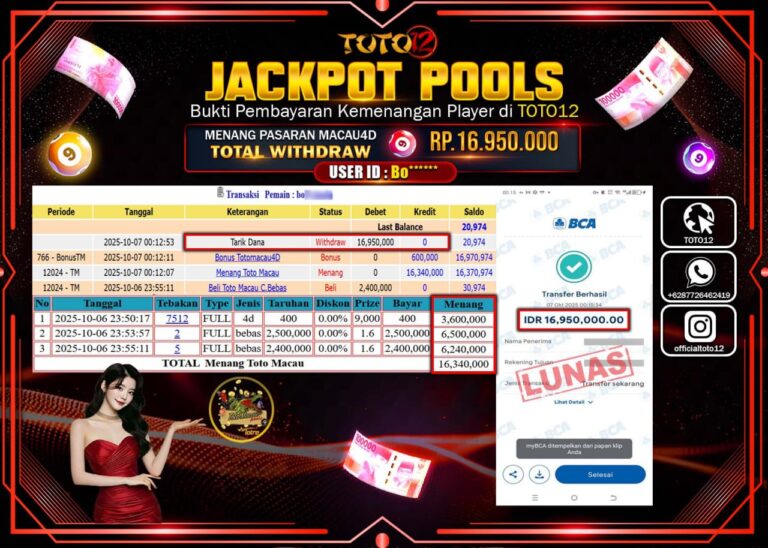 Selamat kepada Member Kami Bo****** Telah Jackpot dan berhasil mendapatkan kemenangan besar pada permainan JACKPOT POOLS PASARAN (MACAU 4D) Dengan Kemenangan Sebesar Rp.16.950.000 –. Setelah mengisi Fomulir Withdraw dengan Kurang waktu 1-2 Menit Dana sudah kami Trasnfer kepada Pemilik Userid dan dana sudah dapat di cairkan oleh pemenang. Bukti Pembayaran yang TOTO12 berikan merupakan Bukti Pembayaran…