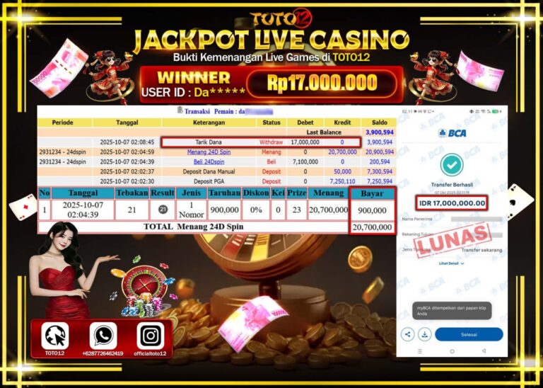 Selamat kepada Member Kami Da****** Telah Jackpot dan berhasil mendapatkan kemenangan besar pada permainan JACKPOT LIVE CASINO (24D SPIN) Dengan Kemenangan Sebesar Rp.17.000.000 –. Setelah mengisi Fomulir Withdraw dengan Kurang waktu 1-2 Menit Dana sudah kami Trasnfer kepada Pemilik Userid dan dana sudah dapat di cairkan oleh pemenang. Bukti Pembayaran yang TOTO12 berikan merupakan Bukti Pembayaran…