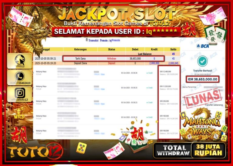 Selamat kepada Member Kami Iq****** Telah Jackpot dan berhasil mendapatkan kemenangan besar pada permainan JACKPOT SLOT GAME (MAHJONG WAYS) Dengan Kemenangan Sebesar Rp.38.653.000 –. Setelah mengisi Fomulir Withdraw dengan Kurang waktu 1-2 Menit Dana sudah kami Trasnfer kepada Pemilik Userid dan dana sudah dapat di cairkan oleh pemenang. Bukti Pembayaran yang TOTO12 berikan merupakan Bukti Pembayaran…
