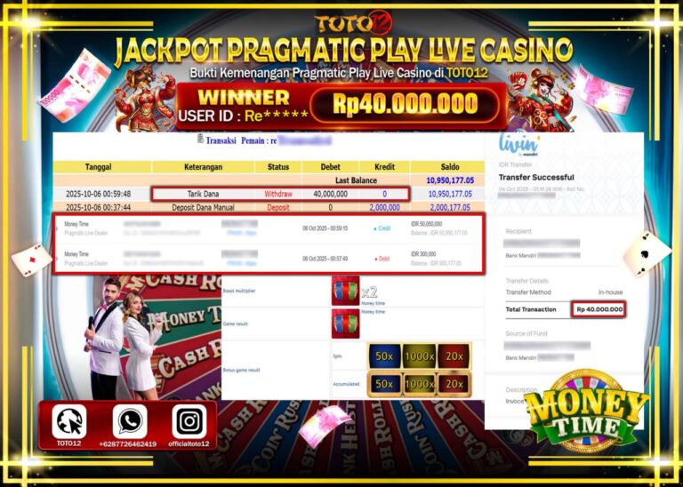HANYA DI TOTO12 JP PASTI DI BAYAR LUNAS DAN CEPAT!!!!!! JACKPOT PRAGMATIC PLAY LIVE CASINO (MONEY TIME) Rp.40.000.000 !!!!