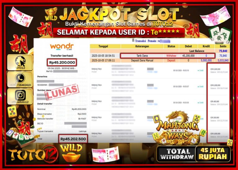 Selamat kepada Member Kami Te****** Telah Jackpot dan berhasil mendapatkan kemenangan besar pada permainan JACKPOT SLOT GAME (MAHJONG WAYS) Dengan Kemenangan Sebesar Rp.45.200.000 –. Setelah mengisi Fomulir Withdraw dengan Kurang waktu 1-2 Menit Dana sudah kami Trasnfer kepada Pemilik Userid dan dana sudah dapat di cairkan oleh pemenang. Bukti Pembayaran yang TOTO12 berikan merupakan Bukti Pembayaran…