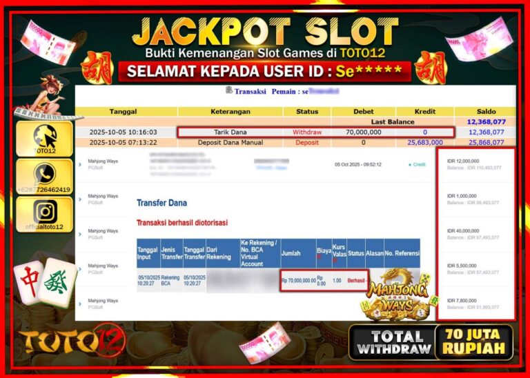 Selamat kepada Member Kami Se****** Telah Jackpot dan berhasil mendapatkan kemenangan besar pada permainan JACKPOT SLOT GAME (MAHJONG WAYS) Dengan Kemenangan Sebesar Rp.70.000.000 –. Setelah mengisi Fomulir Withdraw dengan Kurang waktu 1-2 Menit Dana sudah kami Trasnfer kepada Pemilik Userid dan dana sudah dapat di cairkan oleh pemenang. Bukti Pembayaran yang TOTO12 berikan merupakan Bukti Pembayaran…