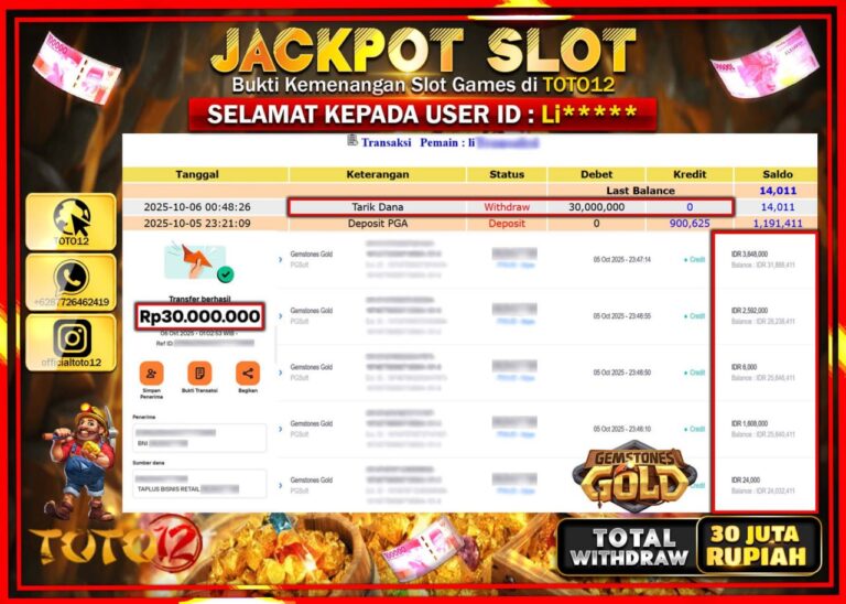 Selamat kepada Member Kami Li****** Telah Jackpot dan berhasil mendapatkan kemenangan besar pada permainan JACKPOT SLOT GAME (GEMSTONES GOLD) Dengan Kemenangan Sebesar Rp.30.000.000 –. Setelah mengisi Fomulir Withdraw dengan Kurang waktu 1-2 Menit Dana sudah kami Trasnfer kepada Pemilik Userid dan dana sudah dapat di cairkan oleh pemenang. Bukti Pembayaran yang TOTO12 berikan merupakan Bukti Pembayaran…