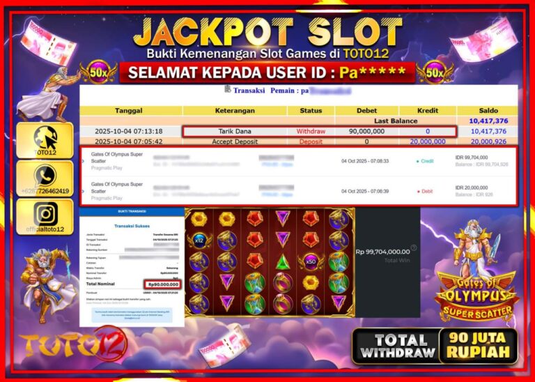 Selamat kepada Member Kami Pa****** Telah Jackpot dan berhasil mendapatkan kemenangan besar pada permainan JACKPOT SLOT GAME (GATES OF OLYMPUS SUPER SCATTER) Dengan Kemenangan Sebesar Rp.90.000.000 –. Setelah mengisi Fomulir Withdraw dengan Kurang waktu 1-2 Menit Dana sudah kami Trasnfer kepada Pemilik Userid dan dana sudah dapat di cairkan oleh pemenang. Bukti Pembayaran yang TOTO12 berikan…