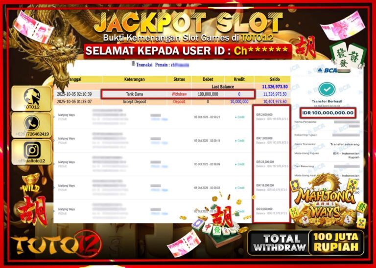 Selamat kepada Member Kami Ch****** Telah Jackpot dan berhasil mendapatkan kemenangan besar pada permainan JACKPOT SLOT GAME (MAHJONG WAYS) Dengan Kemenangan Sebesar Rp.100.000.000 –. Setelah mengisi Fomulir Withdraw dengan Kurang waktu 1-2 Menit Dana sudah kami Trasnfer kepada Pemilik Userid dan dana sudah dapat di cairkan oleh pemenang. Bukti Pembayaran yang TOTO12 berikan merupakan Bukti Pembayaran…