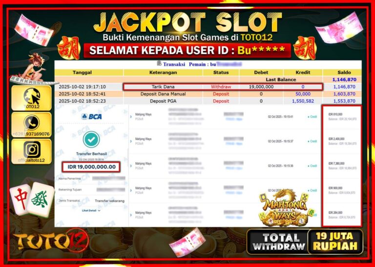Selamat kepada Member Kami Bu****** Telah Jackpot dan berhasil mendapatkan kemenangan besar pada permainan JACKPOT SLOT GAME (MAHJONG WAYS) Dengan Kemenangan Sebesar Rp.19.000.000 –. Setelah mengisi Fomulir Withdraw dengan Kurang waktu 1-2 Menit Dana sudah kami Trasnfer kepada Pemilik Userid dan dana sudah dapat di cairkan oleh pemenang. Bukti Pembayaran yang TOTO12 berikan merupakan Bukti Pembayaran…