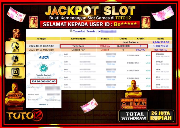 Selamat kepada Member Kami Bo****** Telah Jackpot dan berhasil mendapatkan kemenangan besar pada permainan JACKPOT SLOT GAME (MENTAL) Dengan Kemenangan Sebesar Rp.26.000.000 –. Setelah mengisi Fomulir Withdraw dengan Kurang waktu 1-2 Menit Dana sudah kami Trasnfer kepada Pemilik Userid dan dana sudah dapat di cairkan oleh pemenang. Bukti Pembayaran yang TOTO12 berikan merupakan Bukti Pembayaran yang …