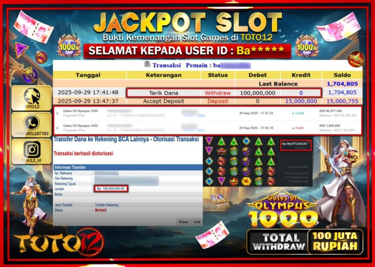 Selamat kepada Member Kami Ba****** Telah Jackpot dan berhasil mendapatkan kemenangan besar pada permainan JACKPOT SLOT GAME (GATES OF OLYMPUS 1000) Dengan Kemenangan Sebesar Rp.100.000.000 –. Setelah mengisi Fomulir Withdraw dengan Kurang waktu 1-2 Menit Dana sudah kami Trasnfer kepada Pemilik Userid dan dana sudah dapat di cairkan oleh pemenang. Bukti Pembayaran yang TOTO12 berikan merupakan…