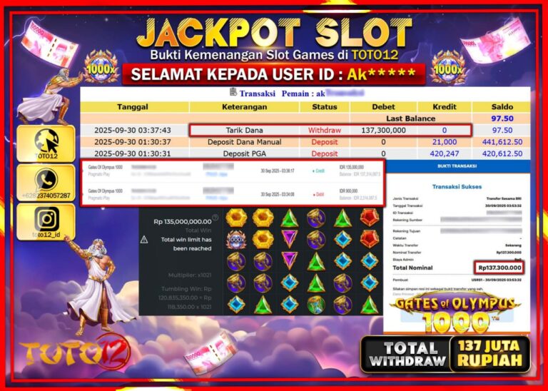 Selamat kepada Member Kami Ak****** Telah Jackpot dan berhasil mendapatkan kemenangan besar pada permainan JACKPOT SLOT GAME (GATES OF OLYMPUS 1000) Dengan Kemenangan Sebesar Rp.137.300.000 –. Setelah mengisi Fomulir Withdraw dengan Kurang waktu 1-2 Menit Dana sudah kami Trasnfer kepada Pemilik Userid dan dana sudah dapat di cairkan oleh pemenang. Bukti Pembayaran yang TOTO12 berikan merupakan…