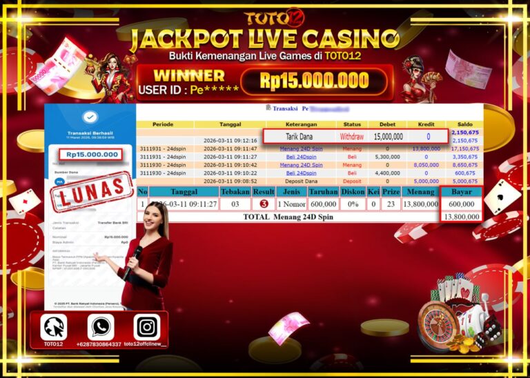 Selamat kepada Member Kami Pe**** Telah Jackpot dan berhasil mendapatkan kemenangan besar pada permainan JACKPOT LIVE GAMES CASINO (24D) Dengan Kemenangan Sebesar Rp.15.000.000–. Setelah mengisi Fomulir Withdraw dengan Kurang waktu 1-2 Menit Dana sudah kami Trasnfer kepada Pemilik Userid dan dana sudah dapat di cairkan oleh pemenang. Bukti Pembayaran yang TOTO12 berikan merupakan Bukti Pembayaran yang SAH…
