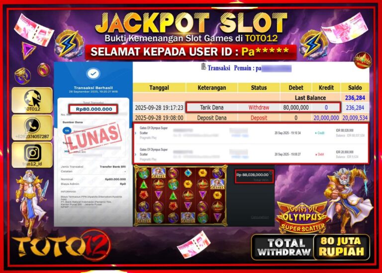 Selamat kepada Member Kami Pa****** Telah Jackpot dan berhasil mendapatkan kemenangan besar pada permainan JACKPOT SLOT GAME (GATES OF OLYMPUS SUPER SCATTER) Dengan Kemenangan Sebesar Rp.80.000.000 –. Setelah mengisi Fomulir Withdraw dengan Kurang waktu 1-2 Menit Dana sudah kami Trasnfer kepada Pemilik Userid dan dana sudah dapat di cairkan oleh pemenang. Bukti Pembayaran yang TOTO12 berikan…