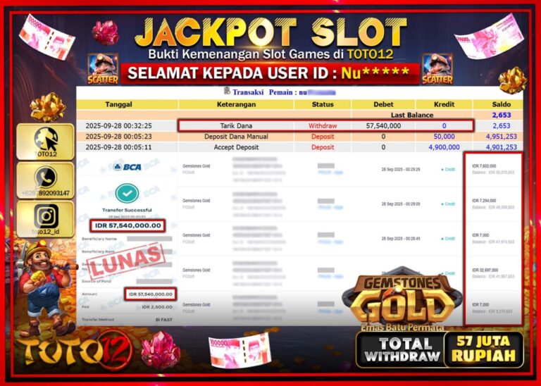 Selamat kepada Member Kami Nu****** Telah Jackpot dan berhasil mendapatkan kemenangan besar pada permainan JACKPOT SLOT GAME (GEMSTONES GOLD) Dengan Kemenangan Sebesar Rp.57.540.000 –. Setelah mengisi Fomulir Withdraw dengan Kurang waktu 1-2 Menit Dana sudah kami Trasnfer kepada Pemilik Userid dan dana sudah dapat di cairkan oleh pemenang. Bukti Pembayaran yang TOTO12 berikan merupakan Bukti Pembayaran…