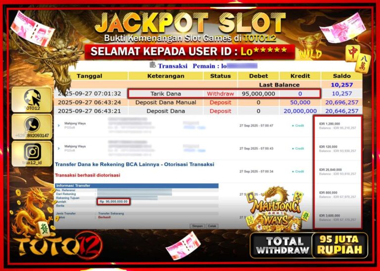 Selamat kepada Member Kami Lo****** Telah Jackpot dan berhasil mendapatkan kemenangan besar pada permainan JACKPOT SLOT GAME (MAHJONG WAYS) Dengan Kemenangan Sebesar Rp.95.000.000 –. Setelah mengisi Fomulir Withdraw dengan Kurang waktu 1-2 Menit Dana sudah kami Trasnfer kepada Pemilik Userid dan dana sudah dapat di cairkan oleh pemenang. Bukti Pembayaran yang TOTO12 berikan merupakan Bukti Pembayaran…