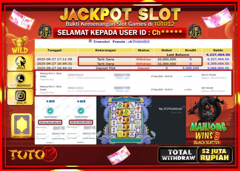 Selamat kepada Member Kami Ch****** Telah Jackpot dan berhasil mendapatkan kemenangan besar pada permainan JACKPOT SLOT GAME (MAHJONG WINS 3 BLACK SCATTER) Dengan Kemenangan Sebesar Rp.52.000.000 –. Setelah mengisi Fomulir Withdraw dengan Kurang waktu 1-2 Menit Dana sudah kami Trasnfer kepada Pemilik Userid dan dana sudah dapat di cairkan oleh pemenang. Bukti Pembayaran yang TOTO12 berikan…