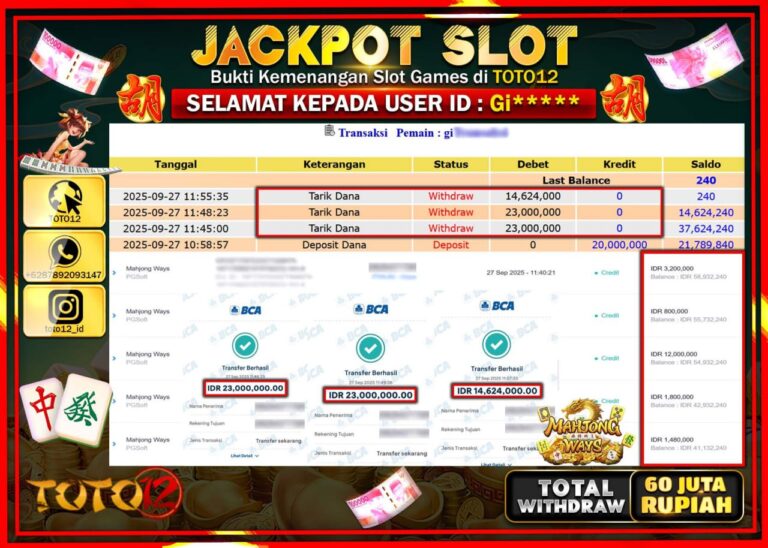 Selamat kepada Member Kami Gi****** Telah Jackpot dan berhasil mendapatkan kemenangan besar pada permainan JACKPOT SLOT GAME (MAHJONG WAYS) Dengan Kemenangan Sebesar Rp.60.624.000 –. Setelah mengisi Fomulir Withdraw dengan Kurang waktu 1-2 Menit Dana sudah kami Trasnfer kepada Pemilik Userid dan dana sudah dapat di cairkan oleh pemenang. Bukti Pembayaran yang TOTO12 berikan merupakan Bukti Pembayaran…